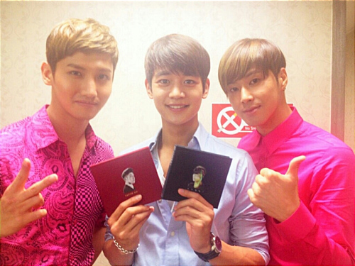 写真の中のミノはユノ、チャンミン二人の間に立って、発売された東方神起の新しいアルバムを持ってカメラに向かって笑顔を見せている。