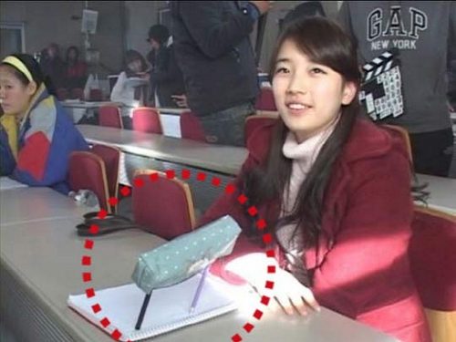 公開された写真は、映画『建築学概論』の撮影現場ということで、ノートに鉛筆とペンケースを固定して作られたこの物体に、制作陣が「何なの?」と尋ねると、スジは「ドルメンを立てた」と答えたという。