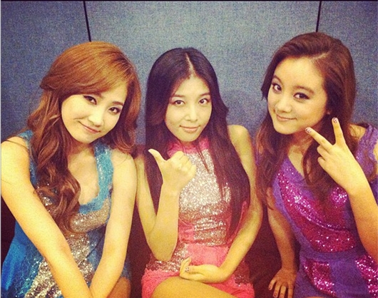 写真の中の3人は、ステージ衣装に身を包んで嬉しそうな表情でカメラに向かってポーズを取っている。