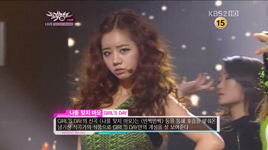この日の放送でガールズデイは軽快なメロディに明るい演出で、初恋のときめきと別れの切なさを表現。「初恋」というテーマとはうらはらに、末っ子メンバー・ヘリのチューブトップのミニワンピなど、メンバーのセクシーなファッションも目を引いた。