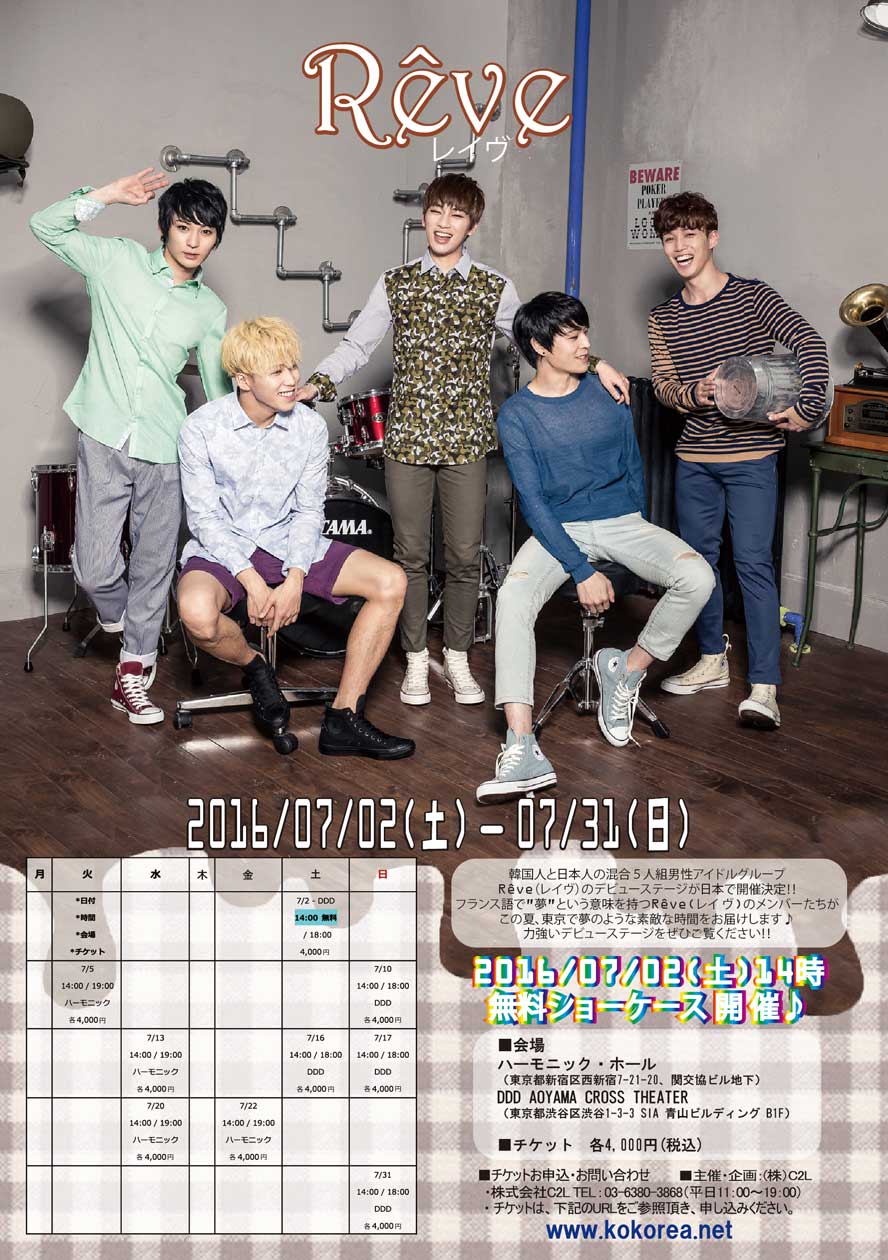韓国で練習を続けてきた日本人と韓国人の5人組の混合ボーカルグループ、[Reve(レイヴ)](SHOW、SEN、WIN、WON-E、KAZUKI)の1stショーケース及び1st公演を7月2日(土)にDDD青山クロスシアター(http://www.ddd-hall.com/ )で開催することが決定した。