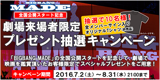 現在「BIGBANG MADE」公式サイトでは、BIGBANG10周年と映画の公開を記念したキャンペーンを実施中。第1弾:劇場ポスター(非売品)が当たる『MY10YEARS×BIGBANG MEMORY 投稿キャンペーン』、第2弾:劇場パンフレットが当たる『映画「BIGBANG MADE」感想投稿キャンペーン』に加えて、メンバー全員のサインが入った映画オリジナルTシャツが当たる『劇場来場者限定プレゼント抽選キャンペーン』も受付中。