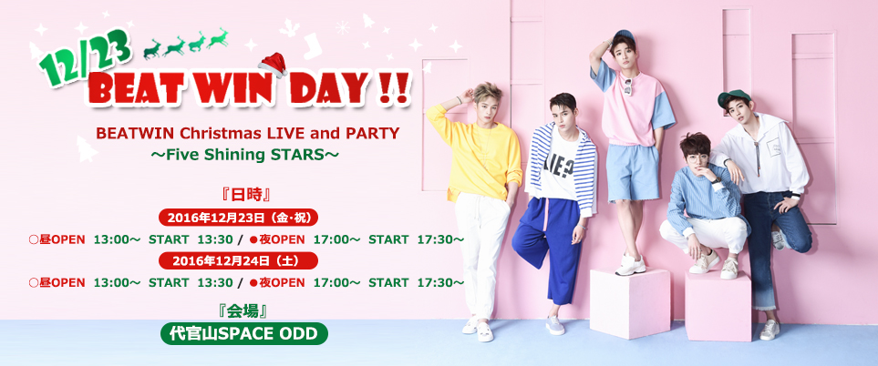 2014年、2015年、そして2016年もクリスマスの時期になると必ず日本に帰ってくるBEATWIN! 今年は、韓国活動曲「Your Girl」でセクシーな大人の男に変身、日本3rdシングル「1!2!3!」では真逆のキュートな男の子へと変わり、いろんな姿で人々を魅了! 韓国でのカムバックに向けて忙しく過ごしている彼らが、人肌が恋しくなる寒い冬、日本のファンと一緒に楽しくクリスマスを過ごそうと、心も体もあたたかくなるようなライブパーティを企画しているとのこと。題して、「BEATWIN Christmas LIVE and PARTY~Five Shining STARS~」。昼は、クリスマスの準備を一緒に楽しむようなアットホームな雰囲気でトークやゲームを一緒に楽しむファンミーティング形式。そして夜公演は、クリスマスツリーの先端に輝くトップスターのように、5つの輝くスターが重なって一つの大きな光となり、クール&セクシー&パワフル&キュート&パッションといった、さまざまな姿を見せながら展開していく熱いライブ!