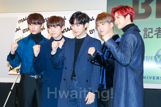 まずは簡単に自己紹介をし、「B1A4はこの先より良い姿をお見せしたいと思い、このたびユニバーサルJに移籍することになりました。僕たちは今後、歌、演技、ミュージカルなどはもちろんのこと、さらにワールドワイドなアーティストになれるように一生懸命努力していきたいと思いますので、どうかみなさん期待してください。そしてこれからも応援をお願い致します。」とリーダーのジニョンがメンバーを代表し冒頭に語った。