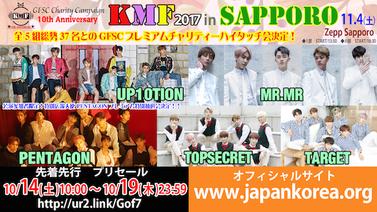 10周年記念「KMF」 第2章は11月4日 札幌!開催迫る! 日本で一番伝統と歴史を誇る秋のK-POP音楽祭「10th Anniversary KMF2017 in SAPPORO」 公演参加者限定!特別広報大使 PENTAGON プレミアム特別抽選会決定!! MR.MR 5人の完全体で日本活動の原点、札幌に約8か月ぶりに帰還! 10/14~ 先着先行プリセール 受付開始!