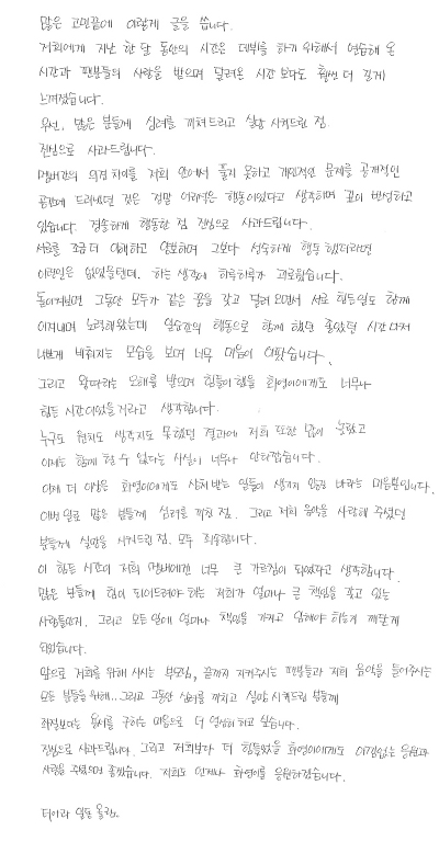 ファヨン脱退に端を発した一連の騒動に関して、ティアラがメンバー手書きの謝罪文を発表した。