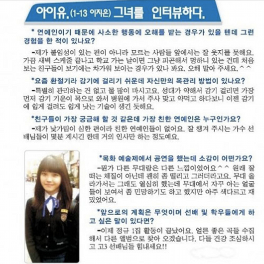 最近、あるオンラインコミュニティに掲載されたのは「2009年、学校新聞アイユ・インタビュー」というタイトルをつけた画像である。