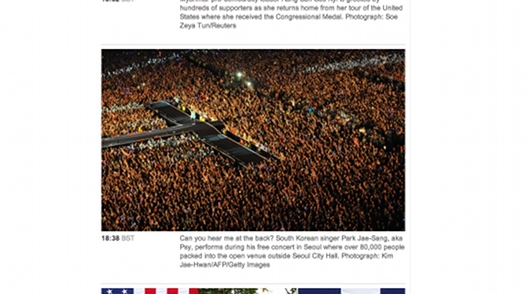 この日選ばれた写真には、米国大統領・オバマ氏の大学での演説や、ミャンマー野党指導者・アウンサンスーチー女史の訪米の様子など、世界の政治・社会情勢を扱ったものが多いが、これに混じって、8万人とも伝えられている大観衆を上空から捉えたインパクトのあるサイのコンサート写真が並んだということだ。