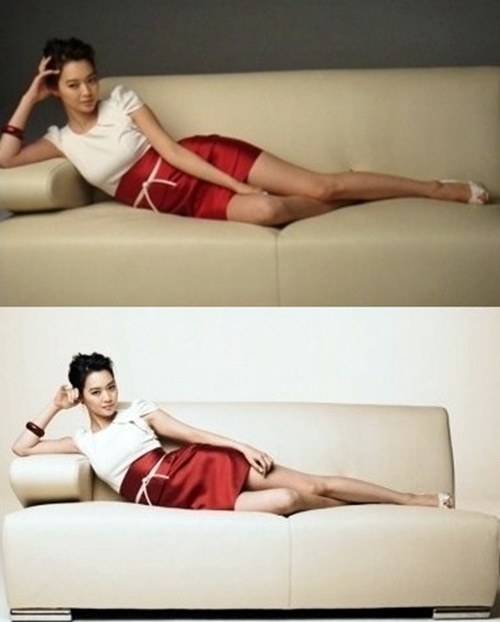 掲載された写真のシン·ミナは、ソファに横になってカメラに相対している。広告撮影現場を捉えたものと伝わるが、比較されているその写真のシン・ミナは、補正前にもかかわらず完璧なボディラインを誇示して目を引いている。