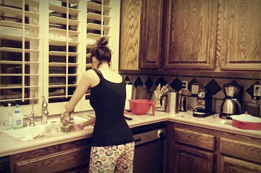 黒いタンクトップにキャラクター柄のパンツスタイルで熱心に家事をこなすNSユンジ。