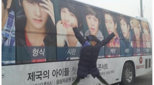 ZE:Aのシワンが海外撮影を終えて、韓国に帰国した。23日にオリンピック公園内SKオリンピックハンドボール競技場で「ZE:A 1st単独コンサート」が行われ、その後日本でのコンサートが行われる。早速コンサートラッピングバスの前でジャンプショットを撮影した。また前日にはメンバーが練習している姿も公開し、「期待していてください」としている。