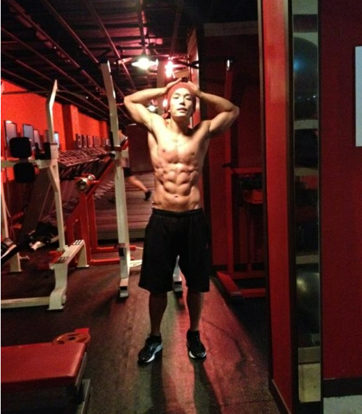 写真の中チャンミンは上半身裸でジムでポーズをとっている。