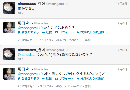 羽田が「韓国は雨?」とヒョナに質問すると、ヒョナは「うん。韓国に来ないの?」と返信。羽田は「いくよ。カカオするね」と返している。