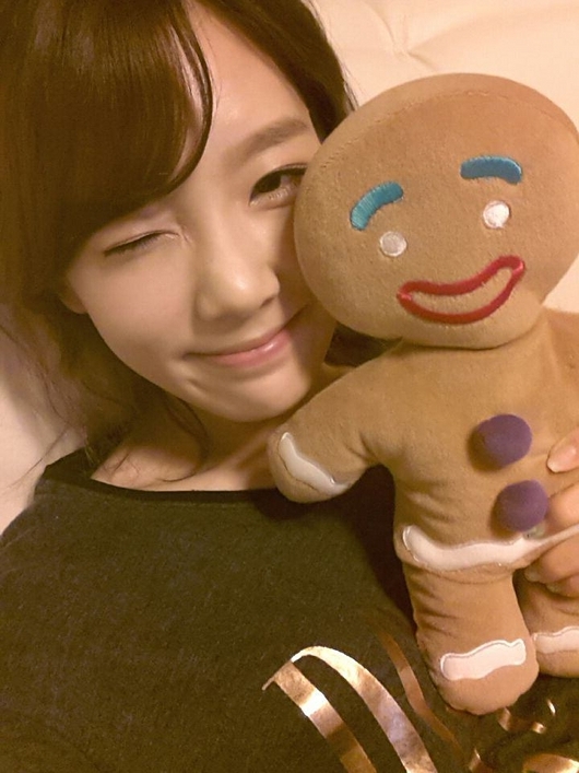 テヨンは普段着姿で片手にジンジャーブレッドマンの人形を持ってカメラに向かってウィンクをしている。